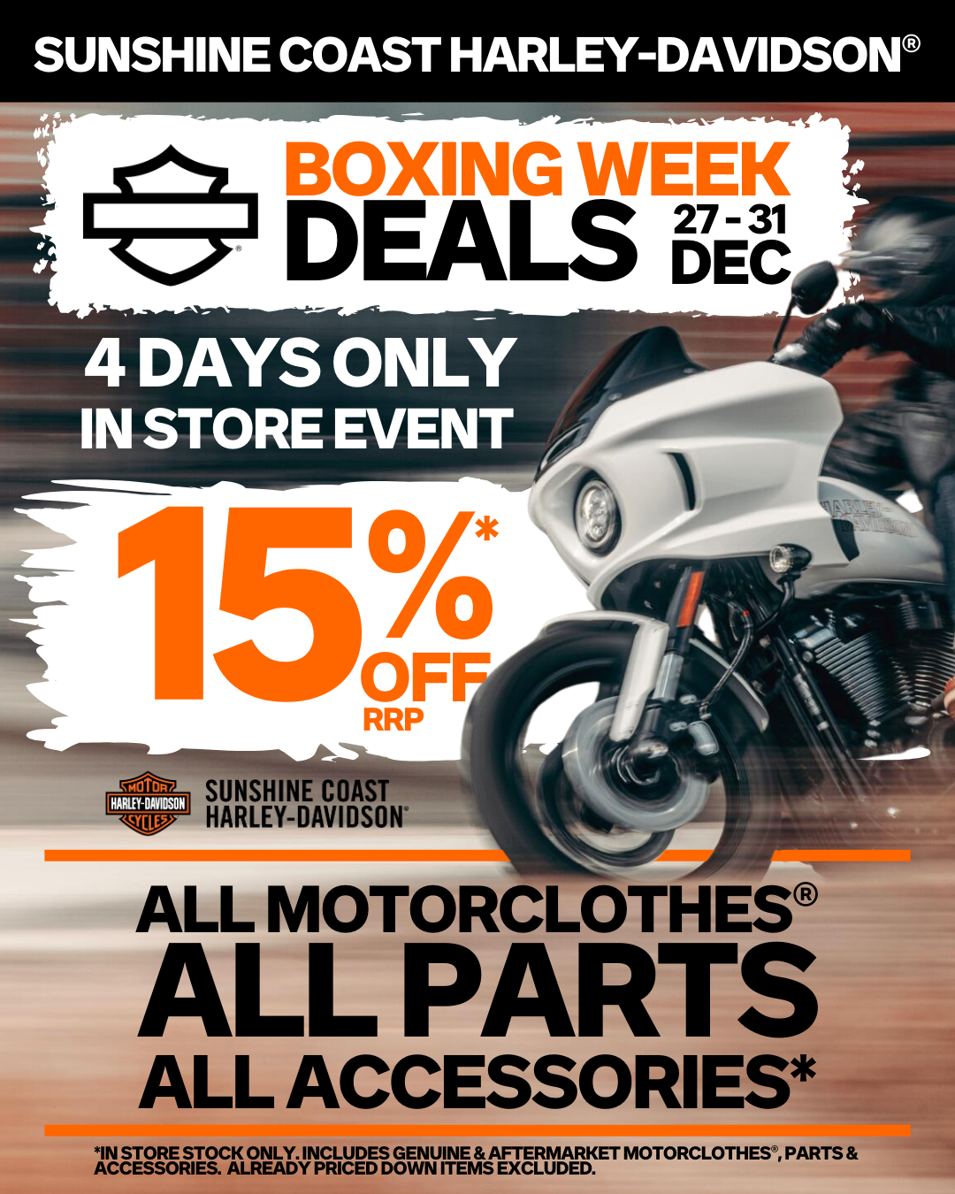 Get 15% Off ALL In Stock Motorclothes®, ALL Genuine Harley-Davidson® Parts & ALL Accessories At Sunshine Coast H-D®.*